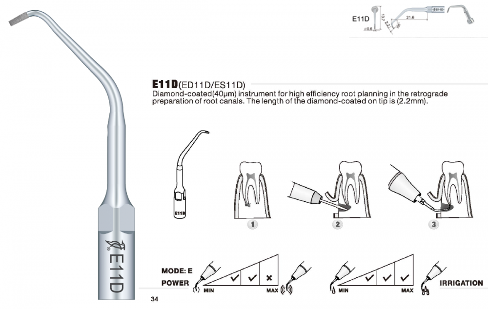 Koncovka diamantovaná (zrnitost40 μm) pro vysoce efektivní ošetření kořenů při retrográdní preparaci kořenových kanálků. Délka diamantem potaženého hrotu je (2,2 mm).