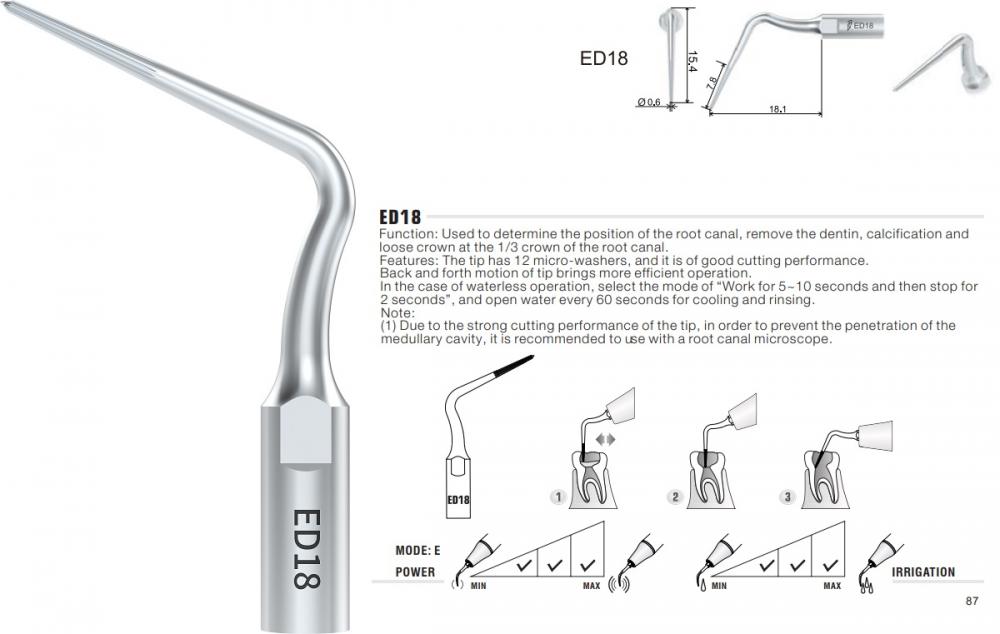 Ultrazvuková koncovka pro lokalizování kanálků, odstranění dentinu, kalcifikací a uvolnění korunky v 1/3 korunky kořenového kanálku. Průměr hrotu 0,6 mm, pracovní délka 7,8 mm.