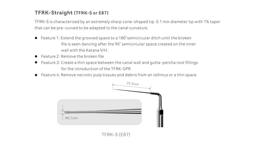Koncovka ED87 S TFRK se vyznačuje extrémně ostrou kuželovitou špičkou: špička o průměru 0,1 mm s 1% kónicitou, kterou lze předtvarovat pro přizpůsobení se zakřivení kanálku.