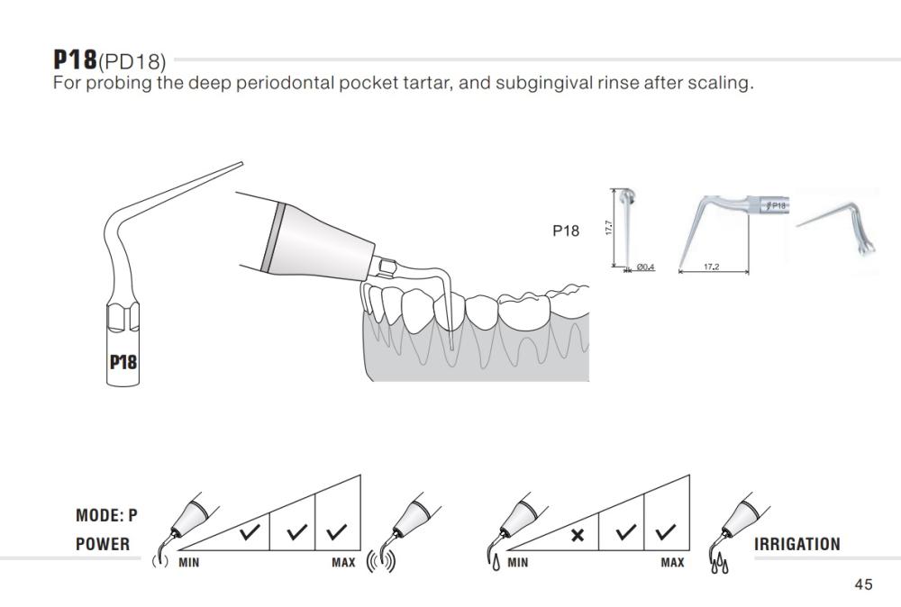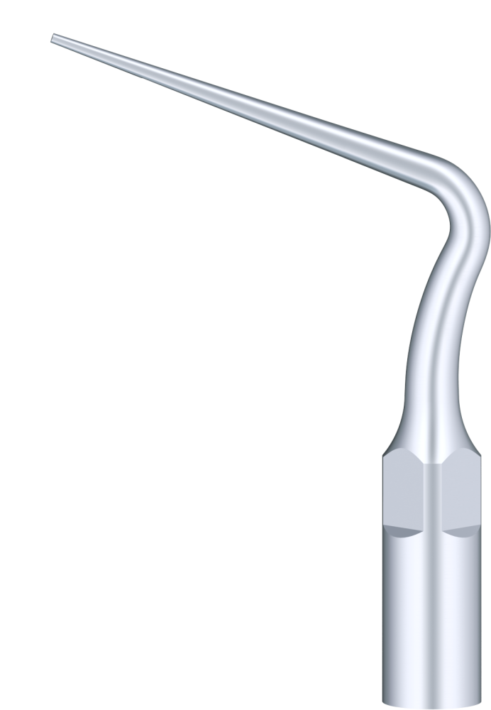 Pro sondování hlubokých parodontálních kapes, zubního kamene a subgingiválního opláchu po čištění zubního kamene.