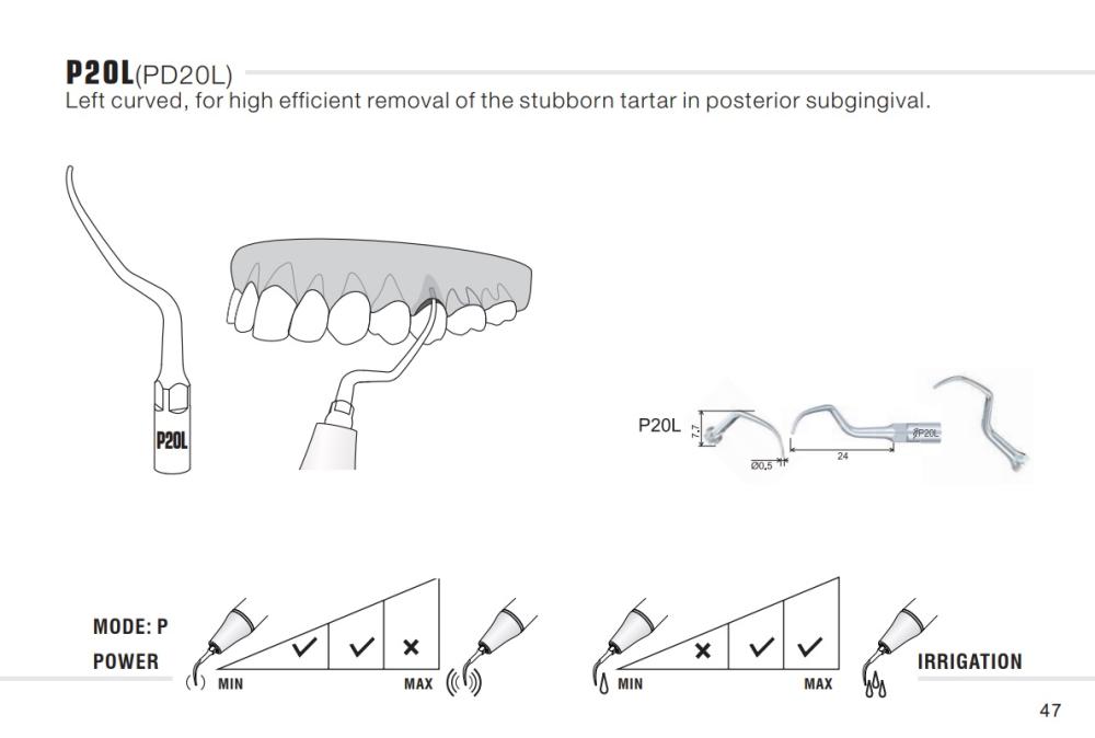 Koncovka levá, pro vysoce účinné odstranění odolného zubního kamene v zadní subgingivální oblasti.