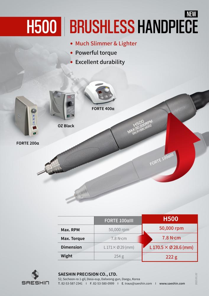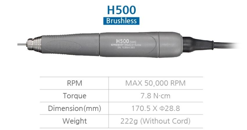 Bezuhlíkový stolní laboratorní mikromotor. Motor H500 (menší a lehčí) je nástupcem kompatibilního Forte 100aIII, alternativa k Mikromotor B50K Supreme. Vysoký točivý moment při nízkých otáčkách. Maximální otáčky 50 000. Kroutící moment 7,8 Ncm. Výkon 230W. Obousměrný provoz. Řízení otáček pedálem nebo na jednotce. Provádíme veškerý servis prodávaných motorů Saeshin (výměny ložisek, čištění, přívodní kabely...).