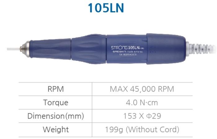 Uhlíkový stolní laboratorní mikromotor STRONG 105LN Vysoký točivý moment při nízkých otáčkách. Maximální otáčky 45 000. Kroutící moment 4,0 Ncm. Obousměrný provoz. Řízení otáček pedálem nebo na jednotce řady STRONG. Provádíme veškerý servis prodávaných motorů Saeshin (výměny ložisek, čištění, přívodní kabely...).