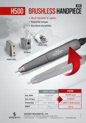 Bezuhlíkový stolní laboratorní mikromotor s kolénním ovladáním i pedálem. Nově s motorem H500 (menší a lehčí). Vysoký točivý moment při nízkých otáčkách. Maximální otáčky 50 000. Kroutící moment 7,8 Ncm. Výkon 230W. Obousměrný provoz. Zobrazení chybových hlášek. Řízení otáček pedálem nebo na jednotce.